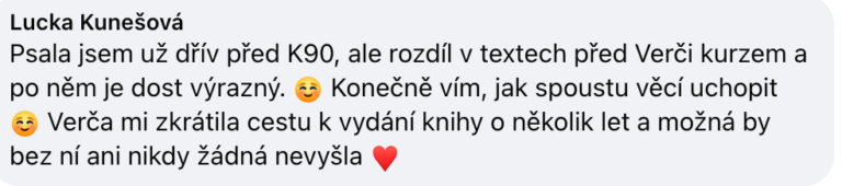 "Verča je úžasná lektorka, jenž má na srdci nás víc a víc posouvat k vytouženému cíli. Její kurzy jsou plné AHA momentů a vychytávek, které pomáhají při psaní, bloku a prokrastinaci. Vše je podáno jednoduchou a srozumitelnou formou. A hlavně komunita kolem ní je milá, vstřícná a nikdo si na nic nehraje."